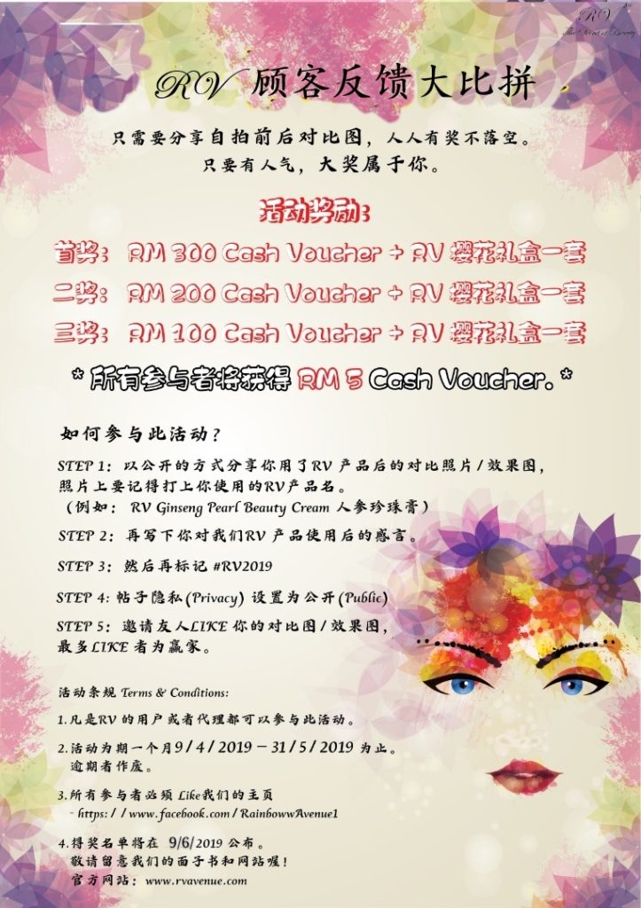 首奖: RM 300 Cash Voucher ➕ RV 樱花礼盒一套